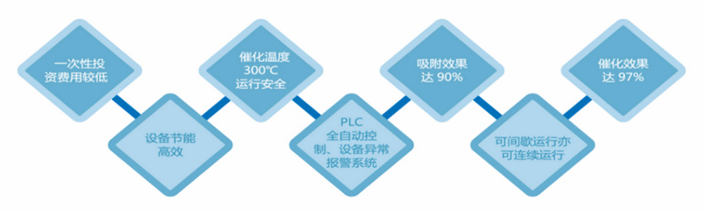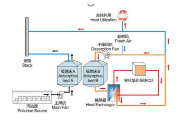 The organic gas adsorption catalytic purification device is suitable for the treatment of low and medium concentration organic waste gas. System principle: mainly according to the adsorption performance of porous activated carbon and the desorption performance of activated carbon at high temperature, the organics are respectively adsorbed and desorbed. The desorbed organics enter the catalytic combustion furnace at 300-400 ℃ for catalytic combustion to oxidize C and H compounds into CO2 and H2O, etc.